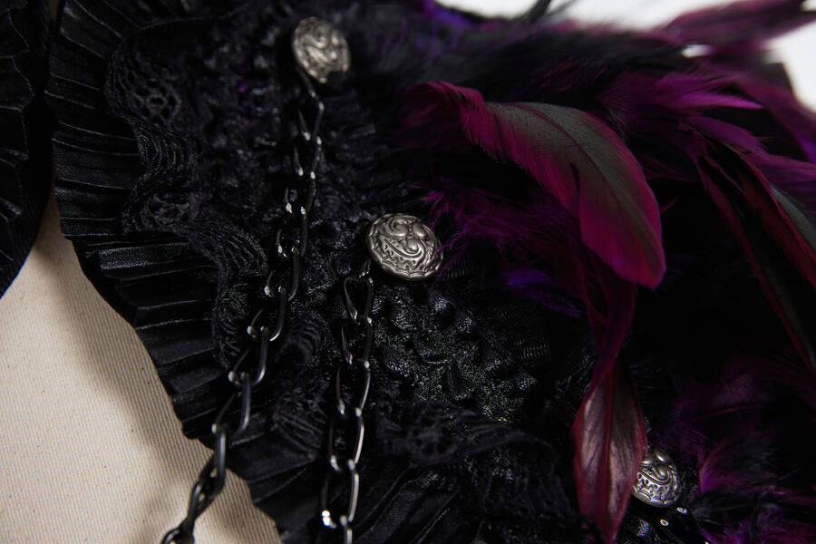 Ce boléro gothique dispose d'un col montant dont les plumes s'étendent au niveau des épaules ainsi qu'un devant en velours et dentelles ornés de boutons argentés, et de chaines.